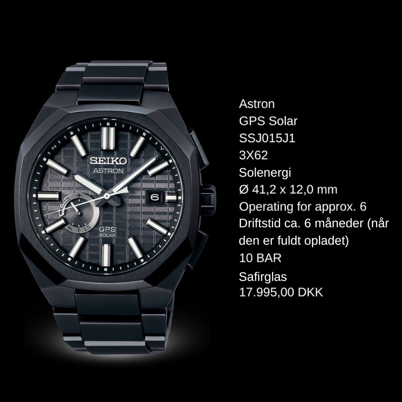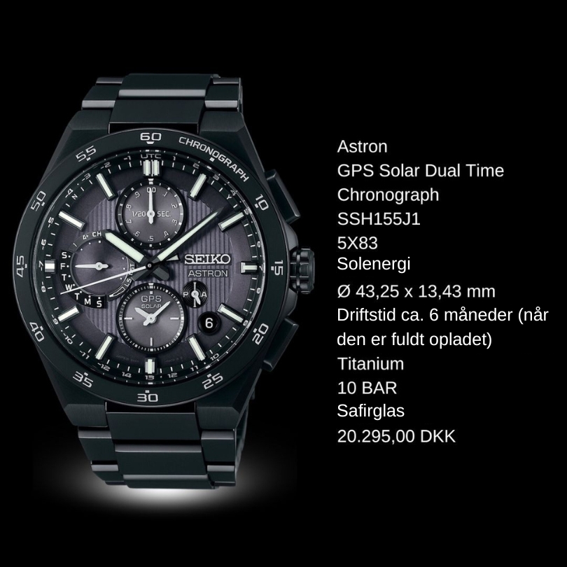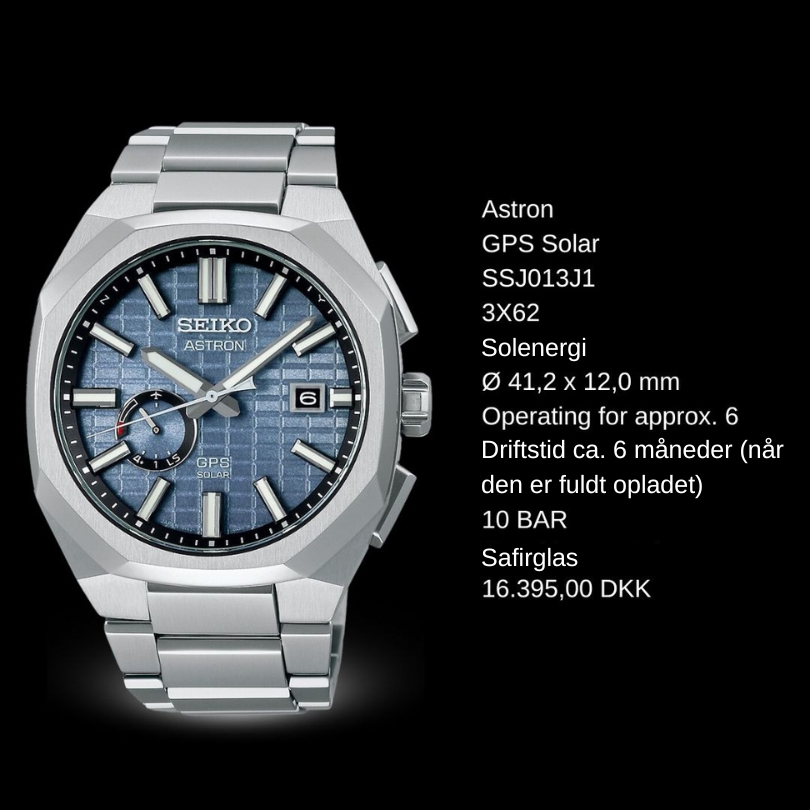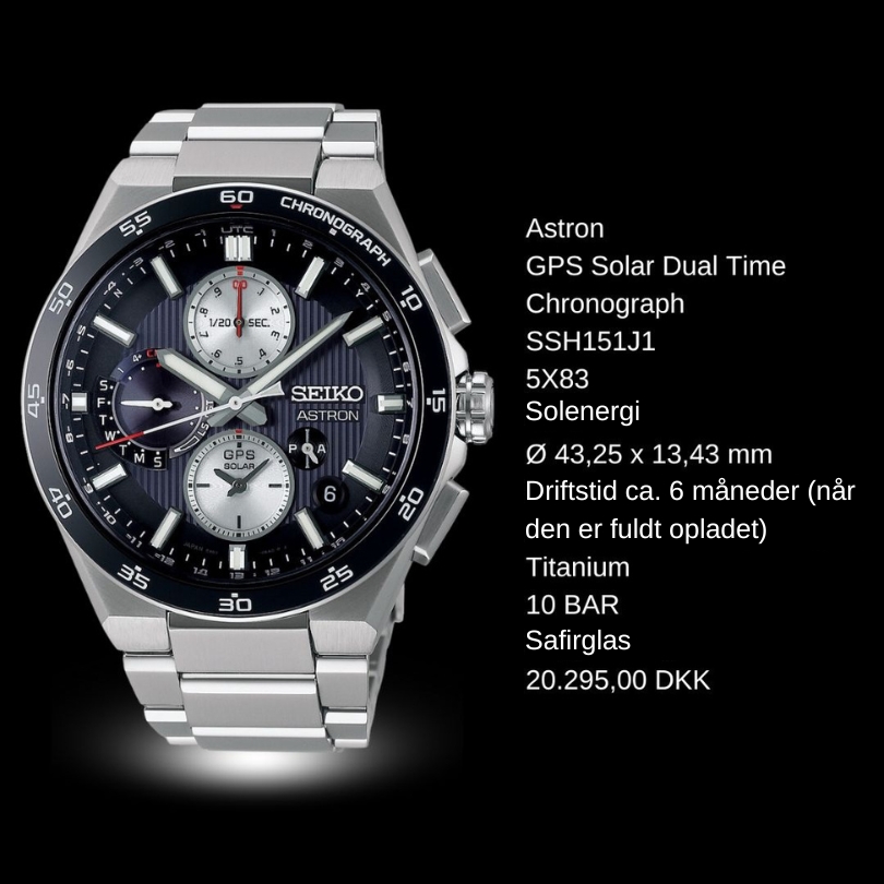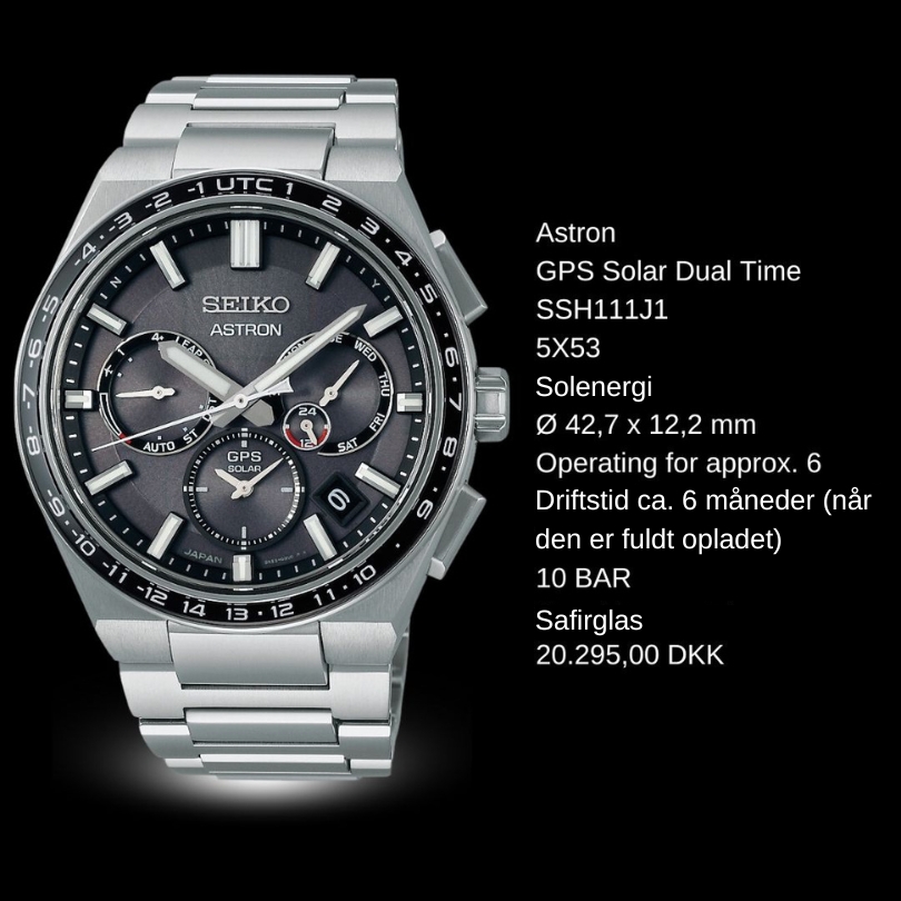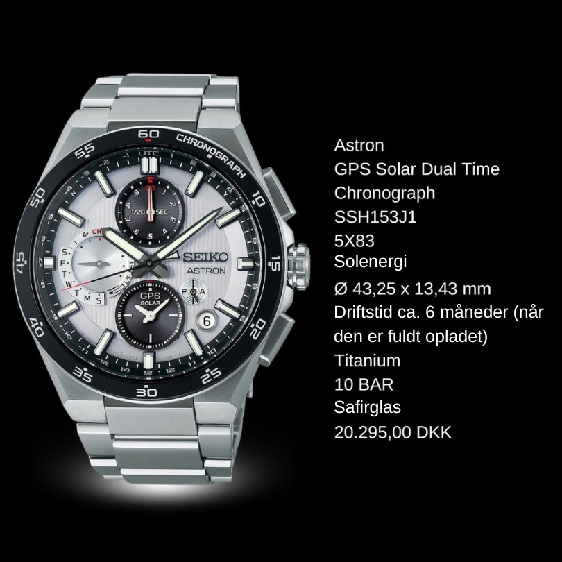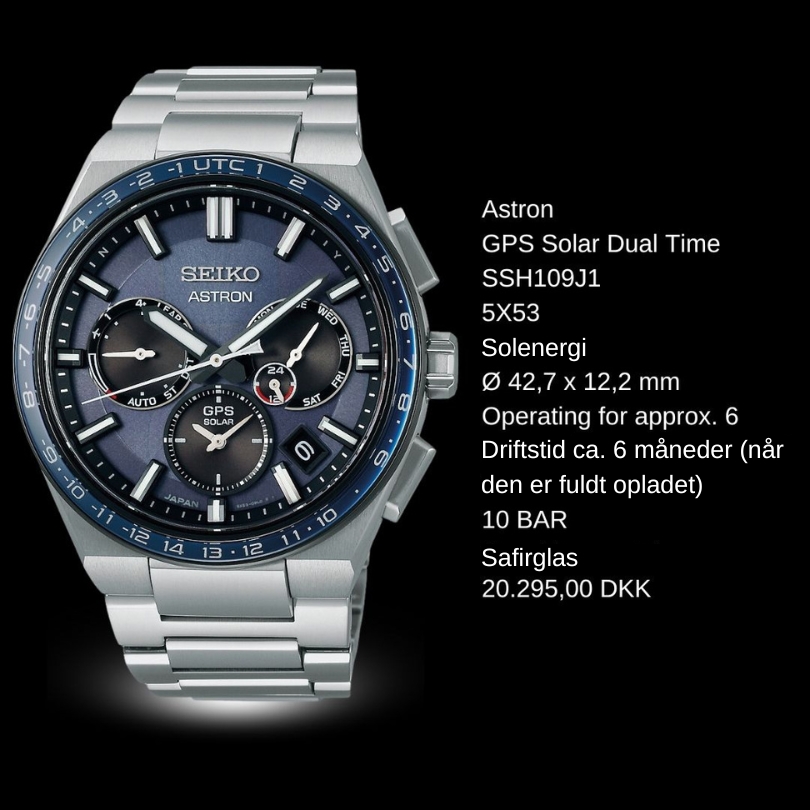Verdens første GPS-solur. Ved at oprette forbindelse til GPS-netværket justerer det nye Astron din tidszone med et tryk på en knap, og da al den nødvendige energi udelukkende kommer fra lys, er det aldrig nødvendigt at skifte batteri. GPS SOLAR SSJ015J117.995,00 DKK SSJ013J116.395,00 DKK GPS SOLAR Dual Time SSH107J120.295,00 DKK SSH109J120.295,00 DKK SSH111J120.295,00 DKK GPS Solar Dual Time Chronograph SSH155J120.295,00 DKK SSH151J120.295,00 DKK SSH153J120.295,00 DKK Discover all collections